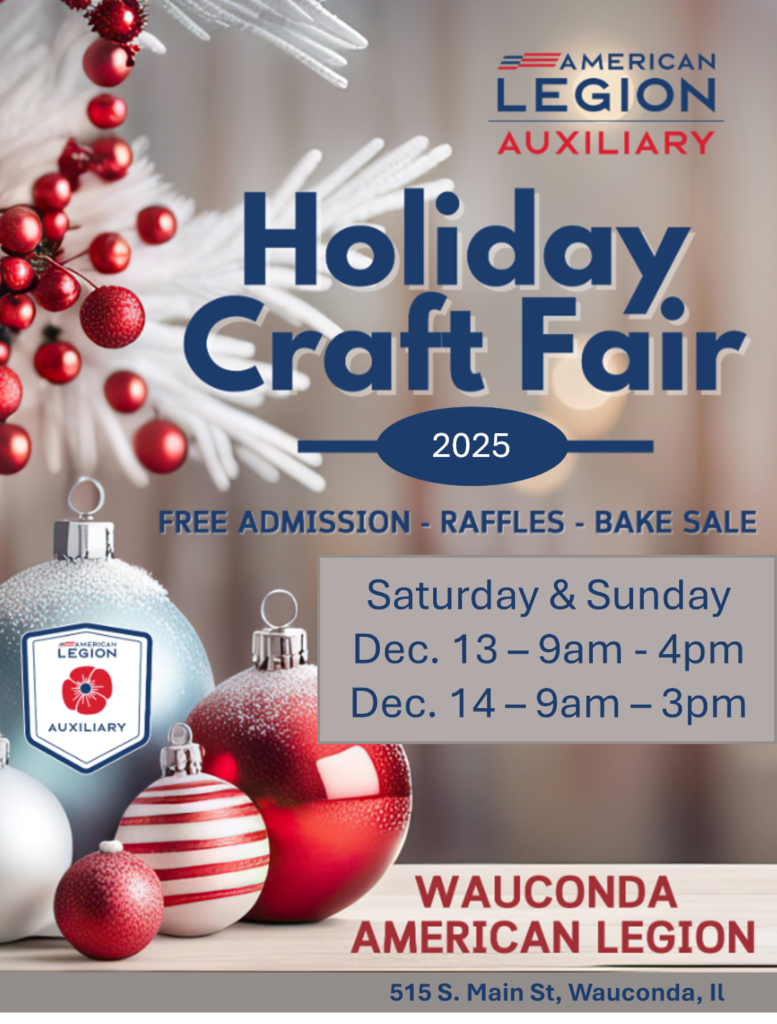 Come join us for the Wauconda American Legion Holiday Craft Fair put together by the American Legion Auxiliary. Come check out all the vendors from all over with items like jewelry, handmade crafts, cigars and many other items for last minute gifts for the holidays.